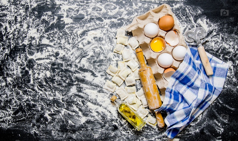 Свежие пельмени с скалкой, яйцами и оливковым маслом