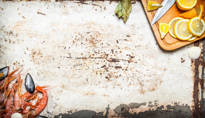 Свежие морепродукты. Креветки и ломтики лимона