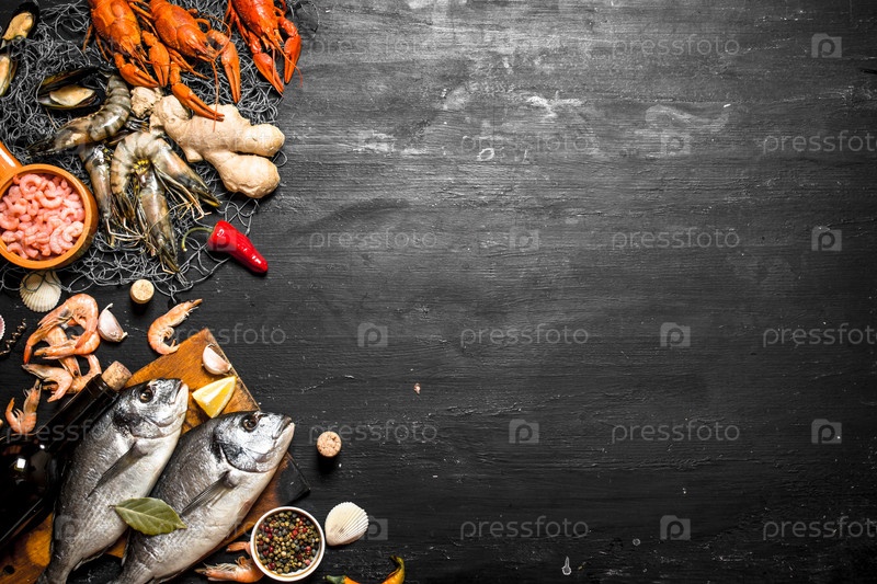 Свежая рыба с бутылкой вина