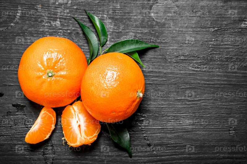 Спелые мандарины с зелеными листьями