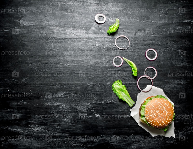 Свежий бургер с луком и зеленью