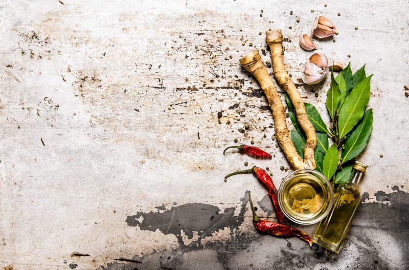Набор специй - перец чили, имбирь, чеснок, лавровый лист и оливковое масло