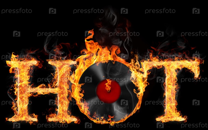 Слово HOT с виниловой пластинкой в огне на черном фоне