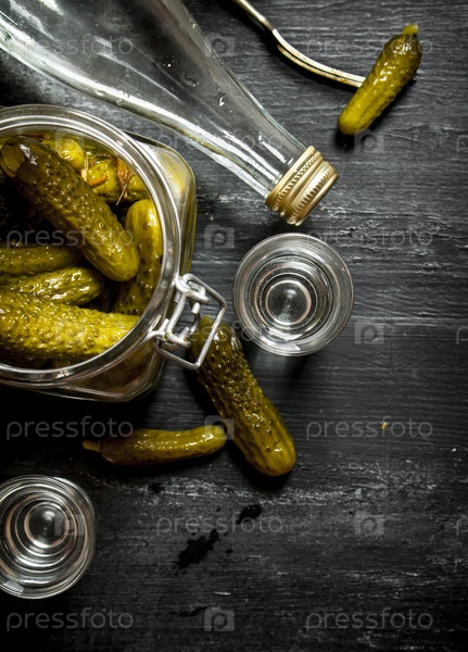 Русский стиль. Бутылка водки с рюмками и солеными огурцами