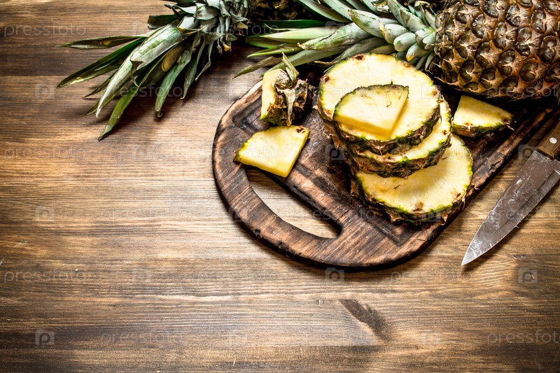 Кусочки ананаса на разделочной доске с ножом