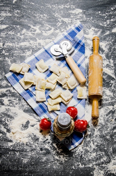 Равиоли с помидорами и скалкой на ткани