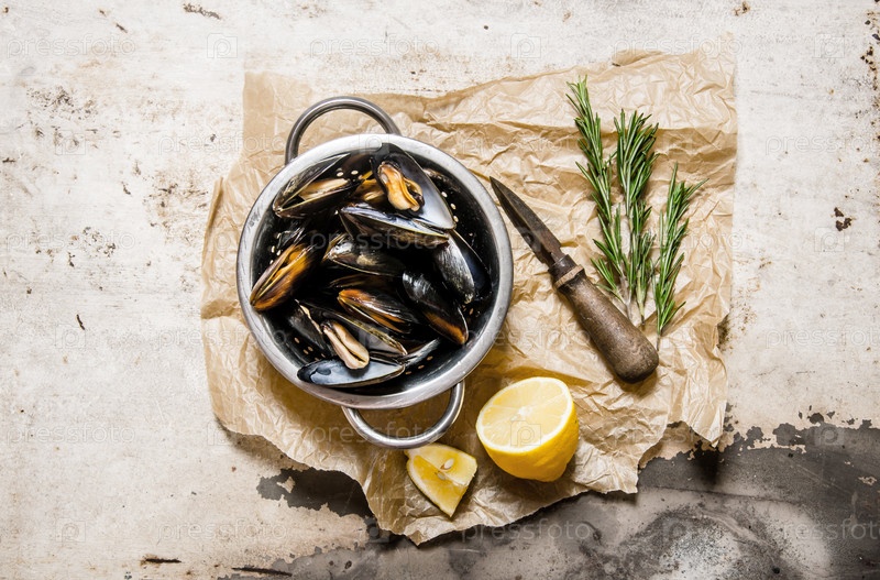 Моллюски в сковороде с лимоном и розмарином