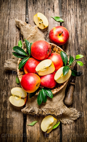 Свежие красные яблоки с листьями в корзине с ножом