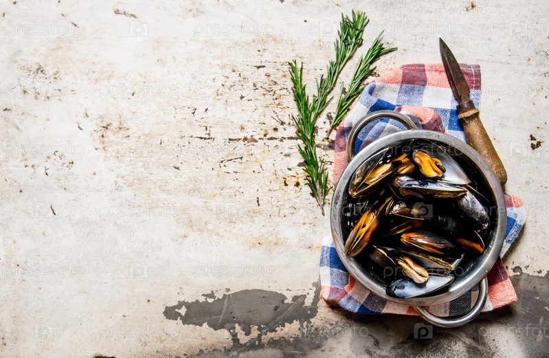 Свежие мидии в миске с ножом и розмарином