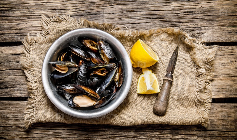Моллюски в чашке с ножом и лимоном на старой ткани
