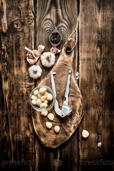 Свежий чеснок на старой деревянной доске