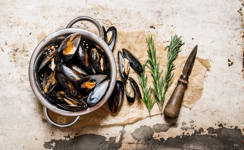 Свежие мидии в кастрюлю с розмарином на старой бумаге