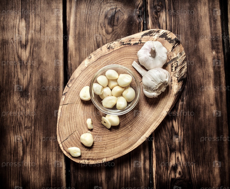 Очищенные зубчики чеснока на деревянном сундуке