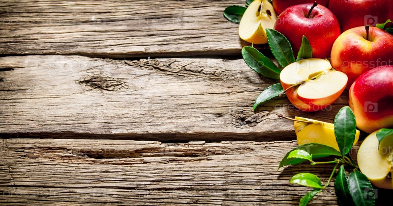 Свежие красные яблоки с зелеными листьями