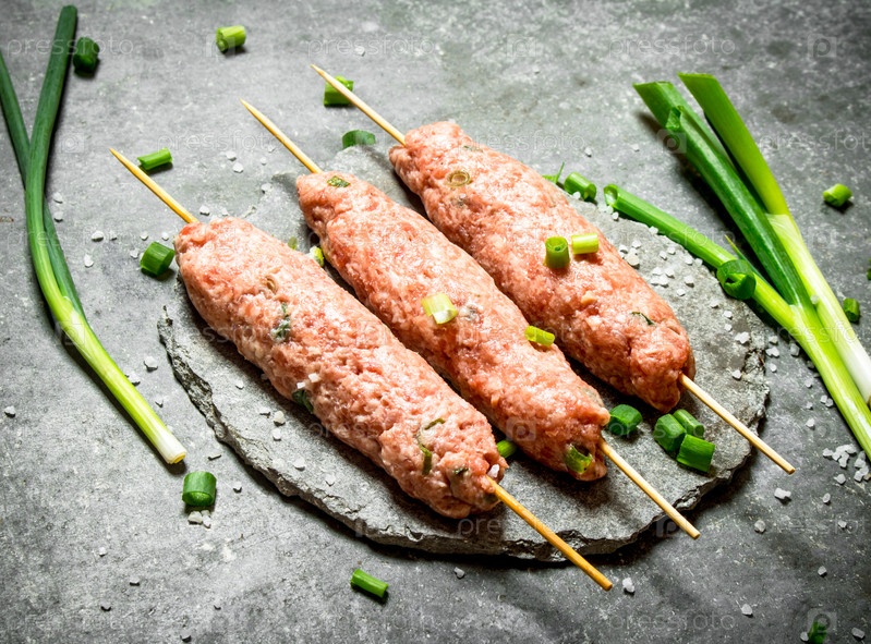Сырые шашлыки на деревянных шпажках с зеленым луком