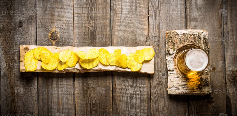 Пиво в стакане на березовом стенде и чипсы
