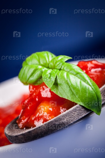 Свежий итальянский томатный соус на синем фоне