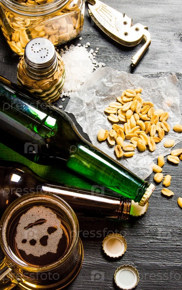 Пиво с арахисом на черном деревянном столе