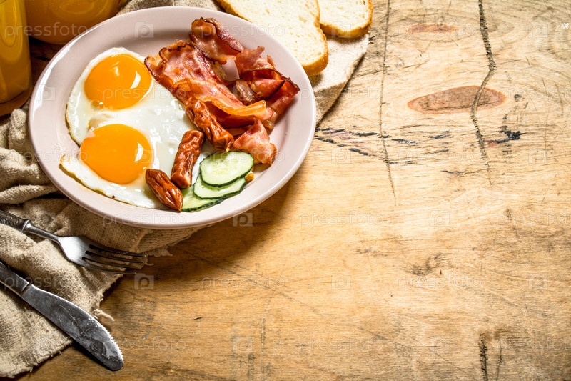 Апельсиновый сок с яичницей, беконом, и ломтиками хлеба