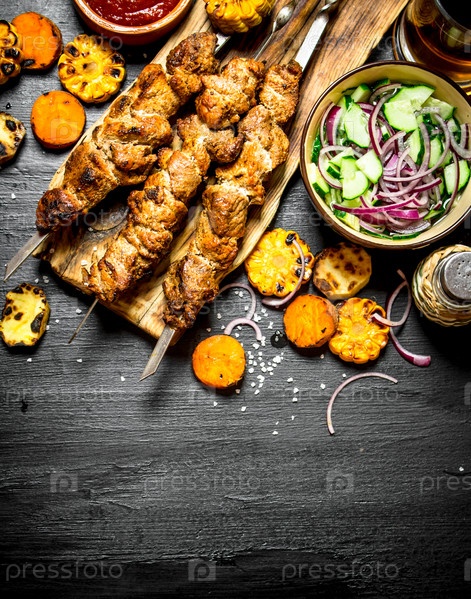 Шашлык на шпажках с овощами и салатом из свежих овощей