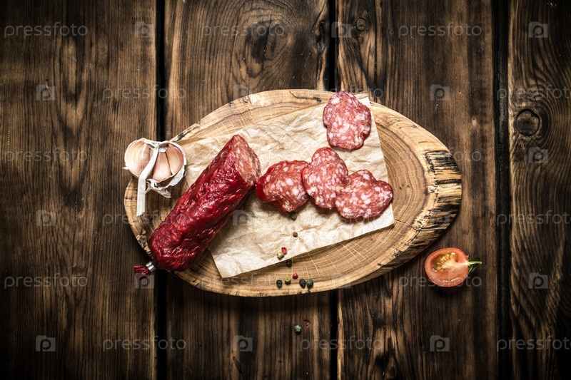 Ломтики салями с чесноком на деревянном сундуке