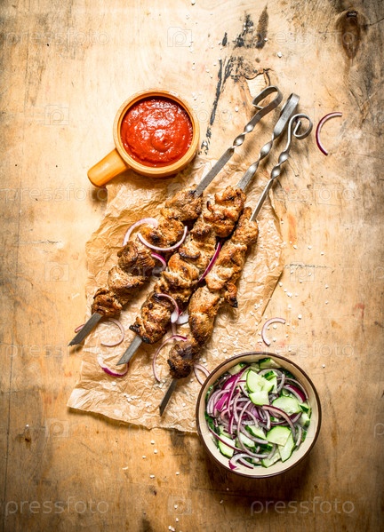 Свежий салат и шашлык на шампурах