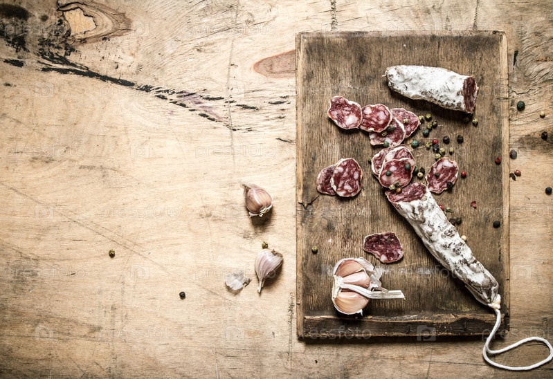Салями со специями и нарезанный чеснок на деревянной доске
