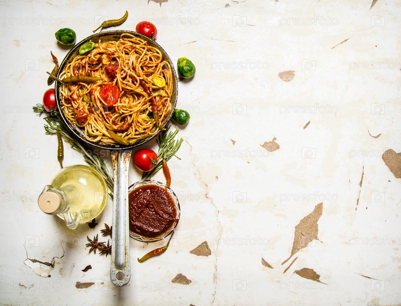 Спагетти с томатным соусом и овощами
