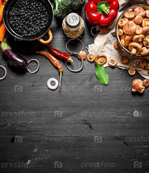 Органическая еда. Свежие овощи с грибами и черными бобами
