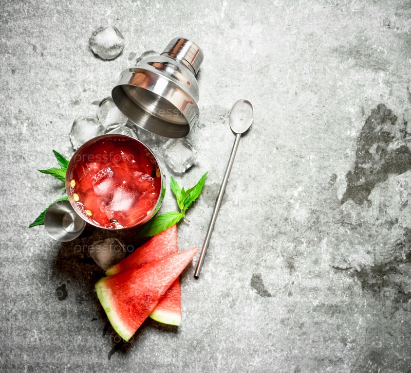 Арбузный коктейль с мятой и льдом в шейкере