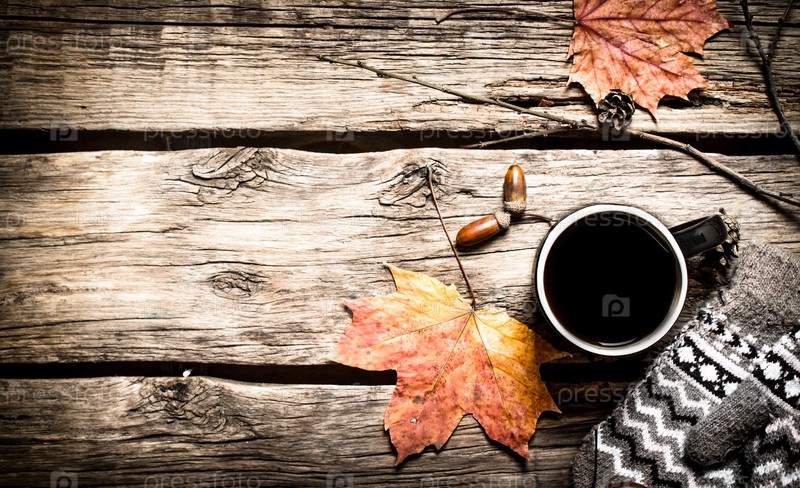 Осенний стиль. Чашка горячего кофе с варежками