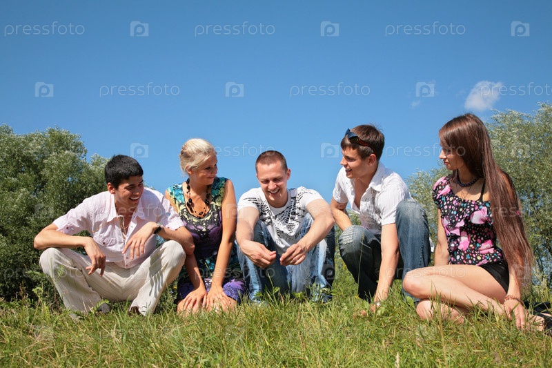 Группа друзей сидят на траве летом