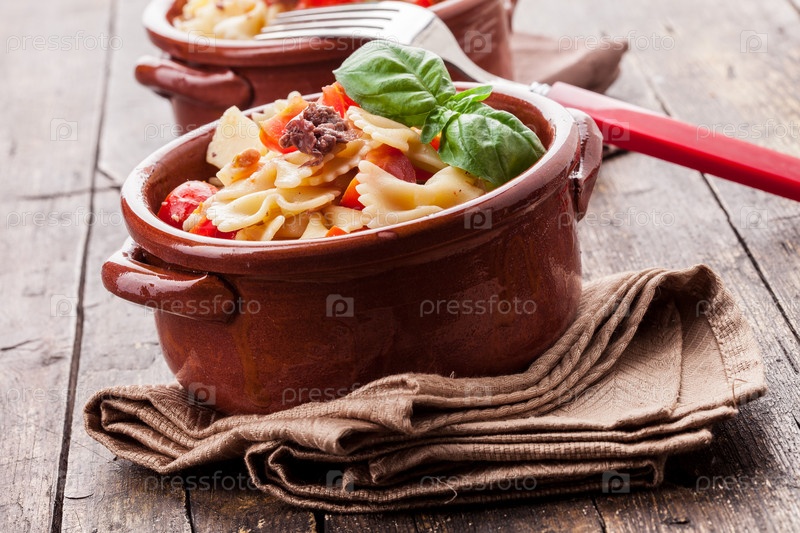 Макароны с помидорами черри и оливками на деревянном столе