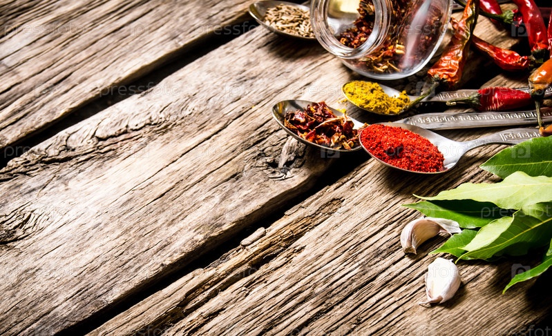 Много различных специй в ложках с травами и чесноком