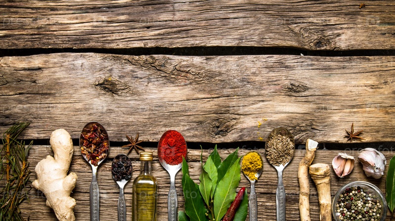 Ароматные специи в ложках с травами, чесноком и оливковым маслом