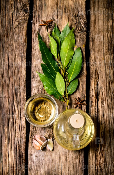 Чеснок и веточки лаврового листа с оливковым маслом