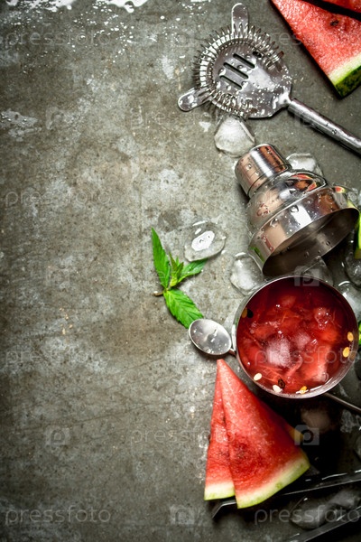 Арбузный коктейль с мятой и льдом в шейкере