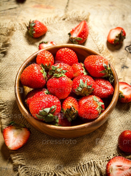 Спелая клубника в миске на мешке