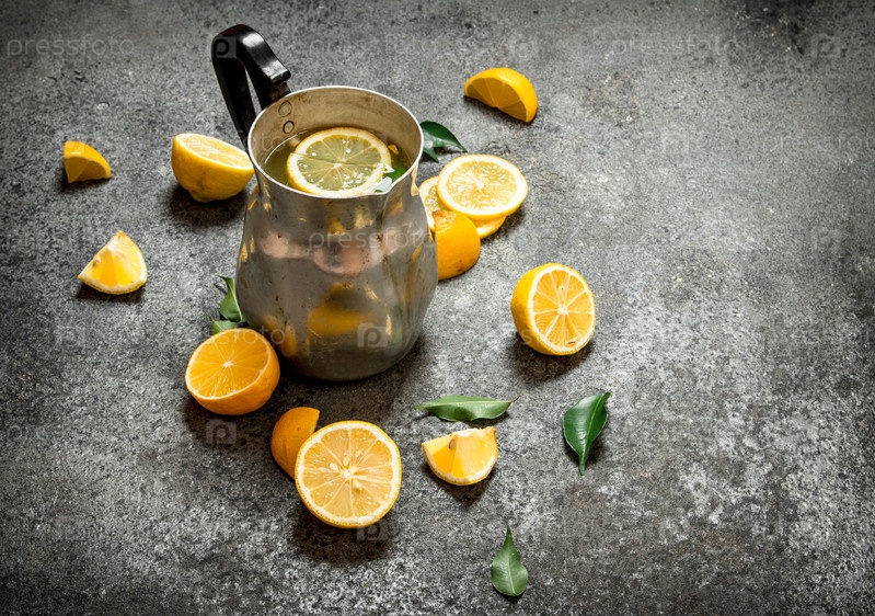 Холодный лимонад в кувшине с ломтиками лимона