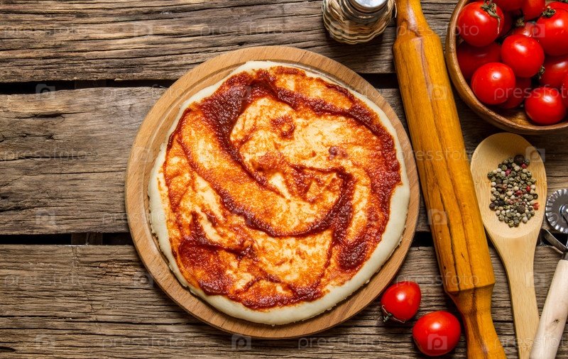 Тесто для пиццы с томатным соусом, скалкой и специями