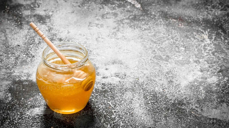 Свежий мед в банке с деревянной ложкой