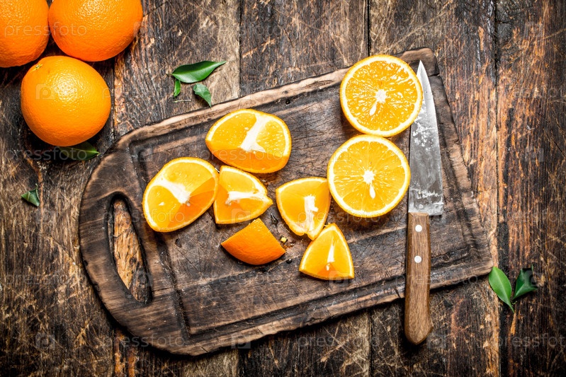Нарезанные дольки апельсина на разделочной доске с ножом