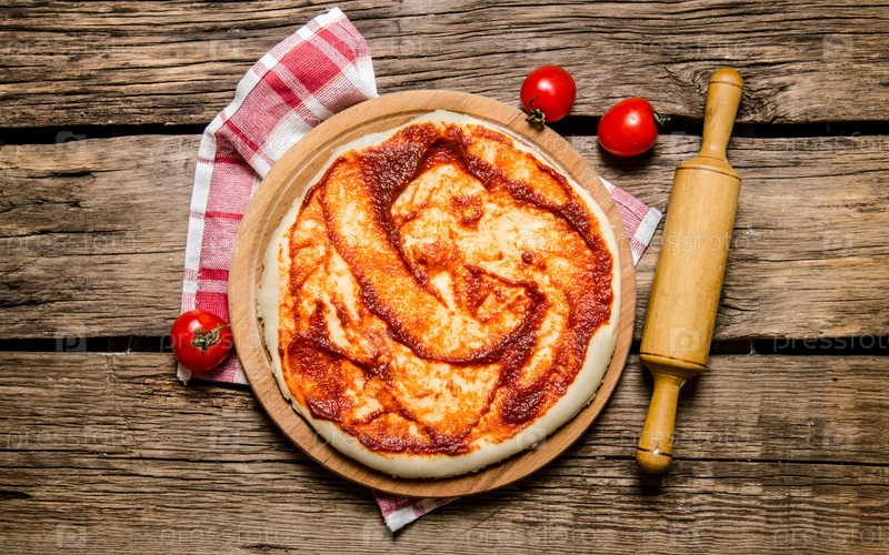 Тесто для пиццы с томатным соусом и скалкой