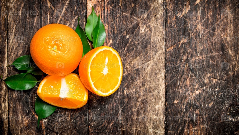 Свежие апельсины с зелеными листьями