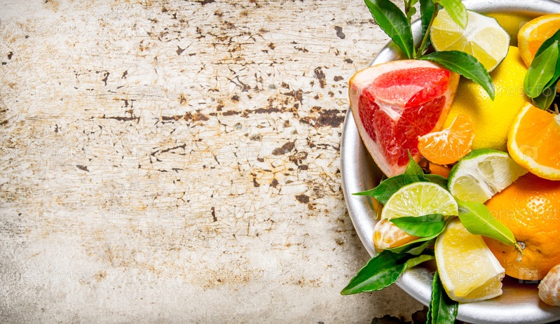 Ломтики цитрусовые - грейпфрут, апельсин, мандарин, лимон, лайм листья в чашке
