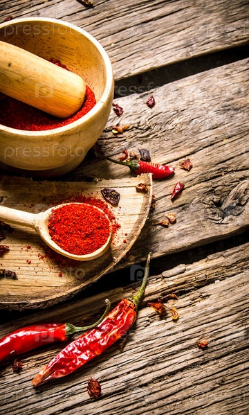 Молотый красный перец в ступке и ложкой на березовой стенде