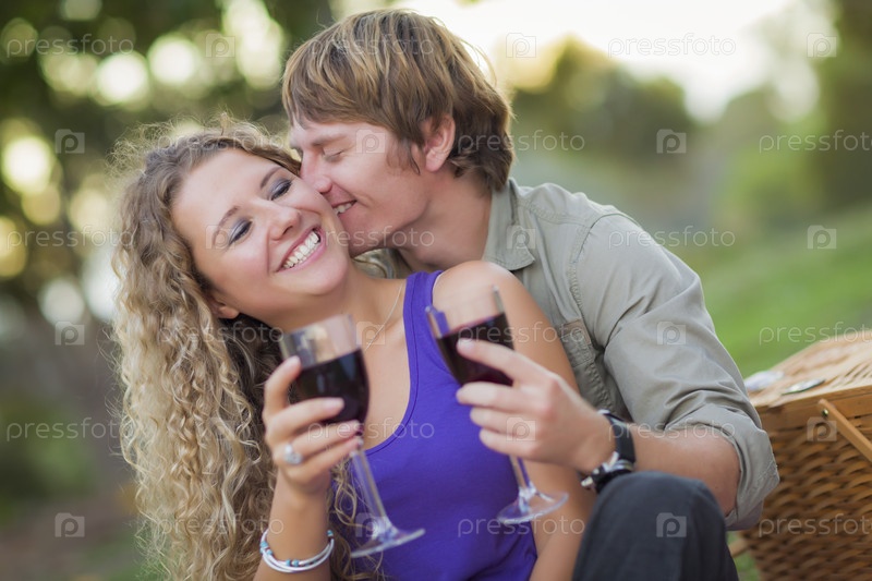 Привлекательная пара наслаждается вином в парке