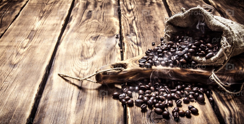 Жареные кофейные зерна в старой сумке