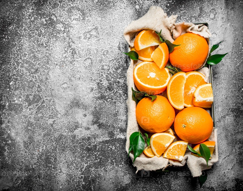 Рубленые кусочки апельсинов в коробке с зелеными листьями