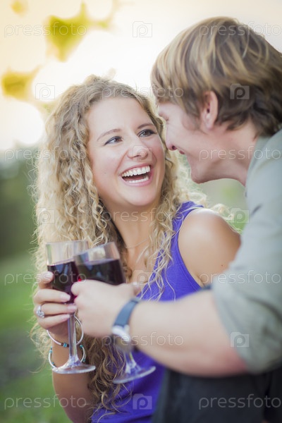 Привлекательная пара наслаждается вином в парке